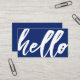 A lighthearted and fun navy blue business card featuring a "hello" script on the front. On the reverse side is a spot for your unique business information.