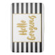Beautiful modern trendy typography brush script quote. "Hello Gorgeous". Featuring a pretty gold metallic glitter frame and gold letters with black and white stripes.