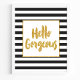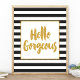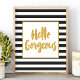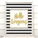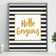 Beautiful modern trendy typography brush script quote. "Hello Gorgeous". Featuring a pretty gold metallic glitter frame and gold letters with black and white stripes.