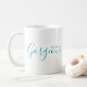 This modern coffee mug features Hello Gorgeous teal script on white background.