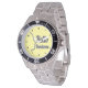 Has heft and feel of expensive stainless steel quartz watches. Good band with safety catch. I removed links, which is easy because engraved arrows show direction to push the linking pins. As always by this seller, the image (a railroad logo) is a perfect reproduction of my emailed image, and is precisely spaced and aligned.