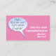 This is a cool pink color business card for English teachers (or any other language teachers) that says 'Hello! How are you? Let's speak English!' inside a fun light blue color bubble speech! Your name and title are on one side in white and your phone number, email, and address are on the other side.