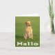 This cute Hello note card features an image of a yellow Labrador Retriever pup sitting in the green grass