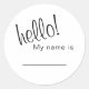 Simple black and white name sticker featuring casual script that says "hello! MY NAME IS." Use it for social gatherings and parties.