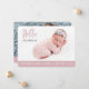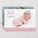 The back of the card features a second photo template to personalise with a family or siblings photograph, or with a further picture of the newborn baby girl. The old pink band on the lower part is personalizable with further details or custom messages in white elegant font.