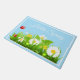 Doormat is shown with a light sky-blue colour background and white border with a hello spring text and a lovely flowers print.