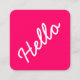 A square hello style profile card template with a simple clean design. A solid colour on the front with "Hello" written in a stylish font placed at 45 degrees. Name, profession/job title along with telephone, email and website address on the reverse side. The name also has an underline in a matching colour to that used on the front, this can also be shortened or lengthened. This template is also a good starting point for further customisation.