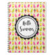 A spiral notebook with an image of a summertime pattern of popsicles and ice cream in watercolors. Hello Summer written in a fun trendy font inside a round whimsical frame.