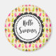A magnet with a sweet summertime pattern featuring popsicles and ice cream cones in colourful vibrant watercolors. Hello summer written in a cute trendy font inside a round frame with a whimsical flower shape.