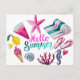 Hello Summer with star fish, beach towel, seahorse, flip flops, ice cream, lemon, sea weed, watermelon and shell on white background.
