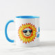 Summer mug featuring the phrase "Hello Summer" and a hand drawn sunflower wearing sunglasses illustration.