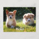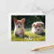 Who can resist the sweet face of a Welch Pembroke Corgi puppy dog. This cute greeting postcard features two tan and white corgies playing in the green grass. These pups are ready to help you send Hello greetings to family and friends