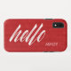 The word "hello" in a modern white cursive script font takes up two thirds of this cool case with a printed red linen texture photo background. A custom name is at the lower right in a smaller simple white sans serif font. Personalise it by adding your name or text in the sidebar. Make a great customised gift for her.