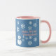 A Slice of Life and Delight presents Hello, Winter Wonderland combo coffee mugs with a snowman decorated with white snowflakes, pink writing, and a blue backdrop. The snowman coffee mugs also have a blue hat and scarf.