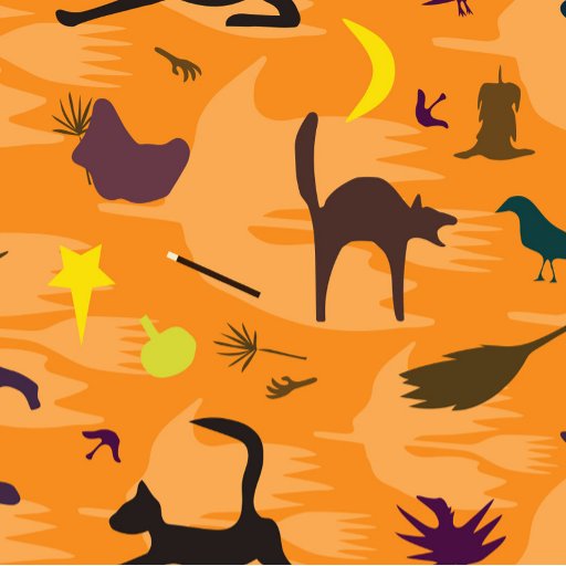 Fun, colorful, witch-themed pattern on bright halloween orange, with a witch, a broom, a moon, a strange bat, and of course more than one kitty cat. This is a fixed pattern, but you can change the size and position of the pattern.