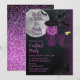 "Hello Witches, It's Party Time!" Halloween "Cocktail Party" design featuring the back of a witch with long flowing purple locks and a purple dress and witch's hat and holding what appears to be a margarita while bats swarm around her head against a moonlit sky. Her familiar black cat looks on from below. Back features a purple faux glitter background. Composite design by Holiday Hearts Designs.