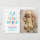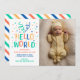 Announce your little bundle of joy with a burst of colour and fun! This modern design features a playful, bouncy font for the "Hello World" message, surrounded by a celebratory confetti explosion. A vibrant colour palette creates a cheerful and celebratory first impression.This cute and versatile design is perfect for announcing the arrival of a baby boy or baby girl and fits in with a gender neutral theme. Personalise this card with a vertical portrait photo of your newborn and easily edit the text templates for your own custom baby announcement.