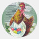 Cute dimensional mother hen with an apron full of colourfully dyed Easter eggs. She is standing in a barnyard with a cute Easter Bonnet on! Matching Easter card: