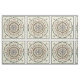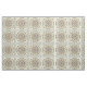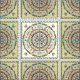 In soft hues of aqua and lavender with melon red accents over an ecru background, a circular mandala of natural shapes, flowers, and paisleys.