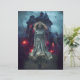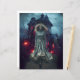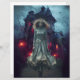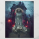 A mysterious young woman in a flowing dress stands in front of a gothic mansion with glowing red windows, set against a dark and eerie sky. Bare trees and flying bats further enhance the atmospheric tension.