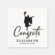 Personalised black and white napkins for her graduation party party featuring a silhouette illustration of a female graduate celebrating in her cap and gown, "Congrats" in a stylish script and her name and class year in simple typography.