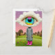 A surreal woman in a grey sweater and pink boots with her head in the clouds and a giant eyeball