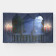 Standing on a candlelit balcony at night, looking out on red roses and a willow tree growing on the grassy bank of a lake. The bright rays of the silver moon stream through the window arches.
