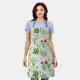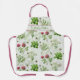 Herbs kitchen apron with place to personalise with name. Pretty pattern of herbs and and bees cover this long apron that comes in two adult lengths. Pink and green colours feature basil, thyme, yarrow and red clover. Little bumblebees fly around the beautiful fresh botanicals. The large herbal pattern has a layered appearance with text across the chest. Pink straps match the pretty clover images.