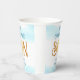 These baby shower paper cups feature the text "Here Comes The Son" in stylish blue and brown typography with a cute yellow watercolor sun and blue sky.