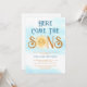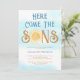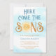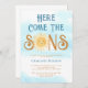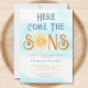 It features the text "Here Come The Sons" in retro typography with a cute yellow watercolor sun and blue sky background.