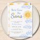Invite family and friends to your sun-themed twin boys' baby shower with this cute invitation. It features the text "Here Come The Sons" in stylish blue typography with a yellow watercolor sun and clouds. The back is decorated with a sun pattern. Easily customisable. Original Watercolor © Michele Davies.