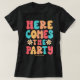 Make way for the groovy bridal party with our funny 'Here Comes the Bride' custom black t-shirt design! This retro-inspired design boasts a burst of colour and whimsy typography that take you back to the groovy era. Perfect for bachelorette parties, bridal showers, or just to celebrate the impending nuptials in style.