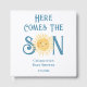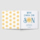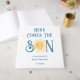 This baby shower guest book features the text "Here Comes The Son" in blue retro typography with a cute yellow watercolor sun.