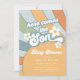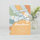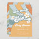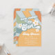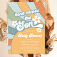 Retro Baby Shower Invitation featuring a boho sun burst blue background , scattered daisy flowers, rainbow, and the words "here comes the son" in a groovy 70's font. Flip our sweet invitation over to view a coordinating blue back.