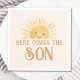 This sun-themed baby shower paper napkin is decorated with a watercolor smiling sun and stylish typography on a soft cream background.