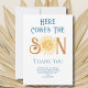 This cute boy's baby shower thank you card features the text "Here Comes The Son" in blue retro typography with a smiling yellow watercolor sun. Easily customisable. Original Watercolor © Michele Davies.