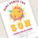 Retro Here Comes The Sun Baby Shower Thank You. Available digitally and printed. A cute colourful sunshine and a 70s vibe for your thank yous. Change text and background colours if you so wish via the edit further option and personalise the text to your own details.