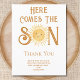 This fun boy's baby shower thank you postcard features the text "Here Comes The Son" in brown retro typography with a cute smiling yellow watercolor sun. Easily customisable. Original Watercolor © Michele Davies.