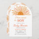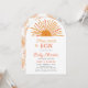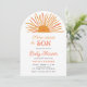 Modern trendy bohemian style "here comes the son" boy baby shower arch shape invitation featuring a rising sun with a small heart and a retro script.