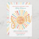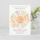 Celebrate the upcoming arrival with this bright and cheerful retro vibe sun-themed baby shower invitation, perfect for a baby boy. The design features a big sun with vibrant rays in yellow, orange, red, teal, and blue at the centre, setting the tone for a joyful celebration. The phrase "Here Comes the Son" is displayed as part of the sun design, with "Son" in big script letters placed over the sun, cleverly using the centre of the sun for the "o" in "Son." At the bottom, all the event details are styled in a combination of font styles and colours—red and teal blue—that complement the sun's rays. The back of the invitation showcases a larger version of the colourful sun. This design is ideal for celebrating the mother-to-be and welcoming a new little ray of sunshine into the world with a touch of boho, retro, and modern flair. Cute Colourful Sun Theme Here Comes The Son Boy Baby Shower Invitation Yellow Orange Red Teal Blue.
