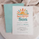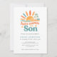 Celebrate the upcoming arrival of your little sunshine with this cheerful “Here Comes the Son” baby shower invitation! Featuring a warm retro-inspired design with a rising sun, palm trees, and soft beachy tones of orange, teal, and gold, this invite sets the perfect tone for a joyful and sunny celebration.