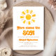 This cute retro sixties boho baby shower invitation features a watercolor yellow and orange sun above the words "here comes the son" in orange and yellow retro typography. Personalise the text with the name of the mum-to-be in and the details in brown sans serif font on a white background. The back of the card is solid orange-yellow. Ideal for a boy's baby shower.