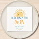 This sun-themed baby shower paper napkin is decorated with a yellow watercolor smiling sun and stylish blue typography.