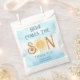 This cute boy's baby shower favour bag features the text "Here Comes The Son" in retro typography with a smiling yellow watercolor sun and blue sky. Easily customisable. Because we create our artwork you won't find this exact image from other designers. Original Watercolor © Michele Davies.