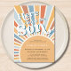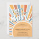Are you planning a boy's baby shower? This colourful sun-themed boy's baby shower invitation features "Here Comes The Son" in retro typography on a sunburst background.