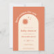 Here Comes the Son Baby Boy Shower Invitation. Designed with minimal boho chic style combined with a modern twist, these adorable invites bring a cheerful vibe to your upcoming baby shower. An orange terracotta colour over a soft white with a retro typography with stars and sun. A trendy arch to frame the details of your celebration.