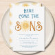 It features the text "Here Come The Sons" in blue retro typography with a cute yellow watercolor sun.