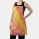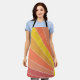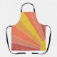 This apron has a mid-century modern design of the sun rising in shades of red, yellow, and orange.