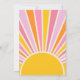 This colourful sun-themed girls' baby shower invitation features "Here Comes The Sun" in retro typography with daisies on a bright pink, orange, yellow, and mauve sunburst background.