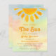 This budget gender-neutral baby shower invitation is decorated with a watercolor sun and "Here Comes The Sun" in stylish retro typography on a colourful watercolor background.